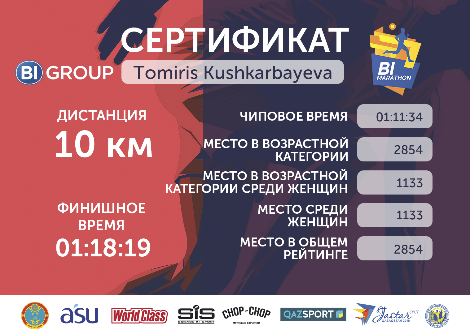 | 3500 | Айдана Абдуали | 4215 | 00:14:48 | 00:39:59 | 01:29:47 | 01:22:40 | |