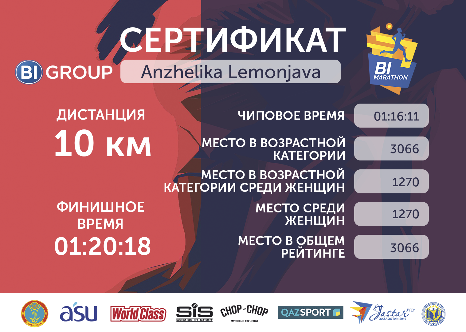 | 3066 | Anzhelika Lemonjava | 6974 | 00:10:28 | 00:33:55 | 01:20:18 | 01:16:11 | |